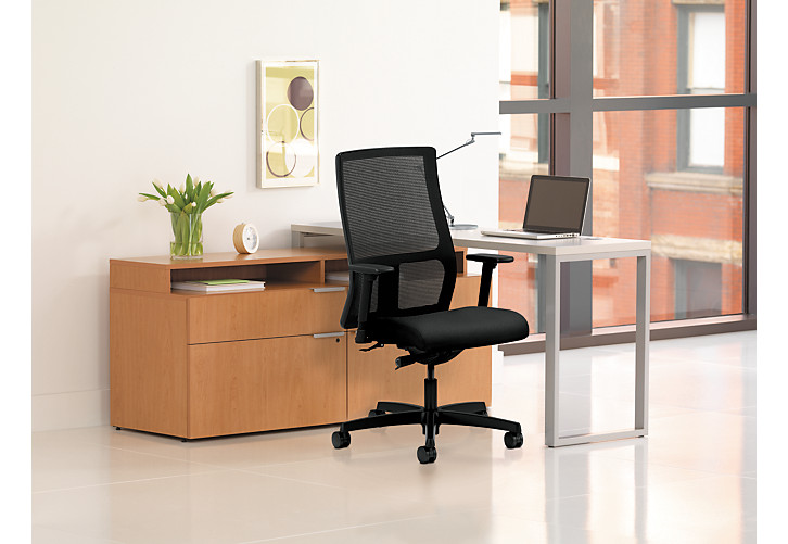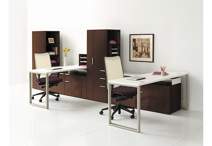 This non-handed low credenza can be partially nested under a primary worksurface to create an L-workstation. To create a U-workstation, it can be nested between the front and back worksurfaces in place of a bridge. It combines space-saving lateral filing, supply storage and convenient open shelves with a low-profile design for a sophisticated, layered look.