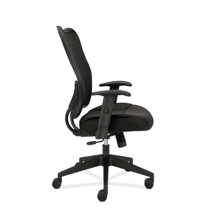 This HON Wave executive high-back chair with mesh back has 2-to-1 synchro tilt with lock and tension control. Black sandwich mesh seat and height-adjustable arms give this chair an upscale feel at a compelling price. Seat upholstery color is Black and back mesh color is Black.