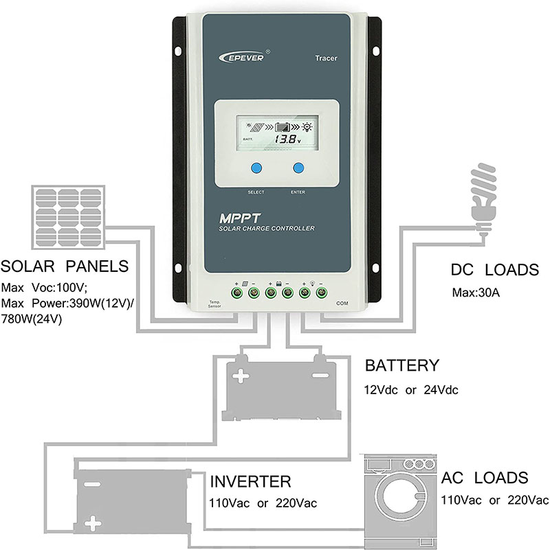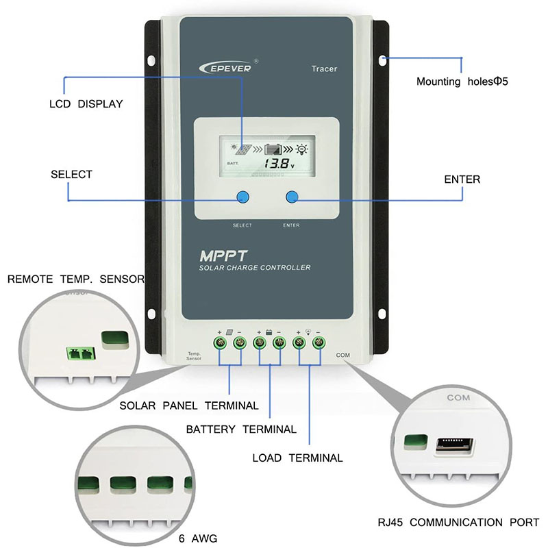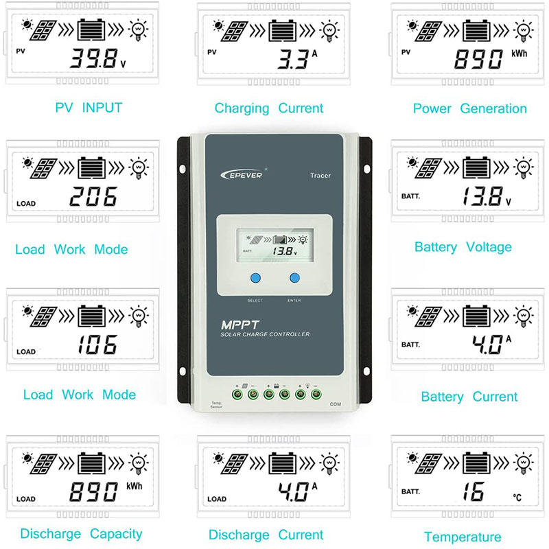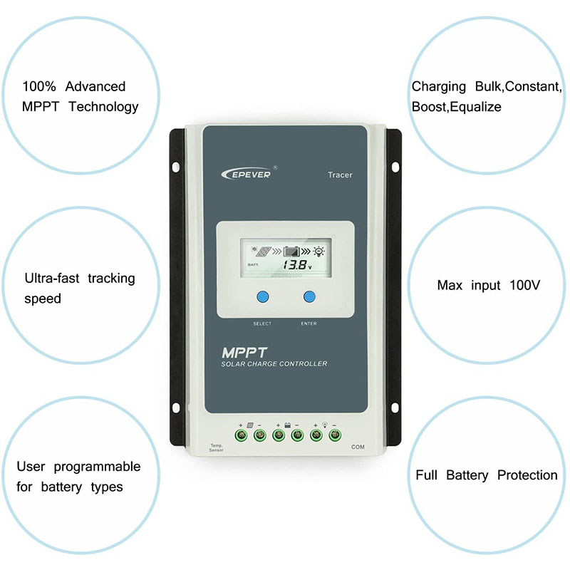 - 30Amp solar charge controller, tracer AN series advanced MPPT control algorithm. The products can track the MPP point fast and accurately in any situation which will improve energy efficiency and obtain the maximum solar energy.