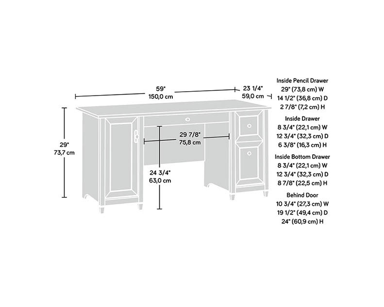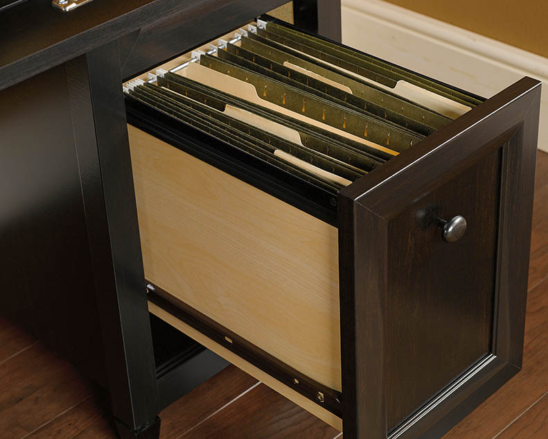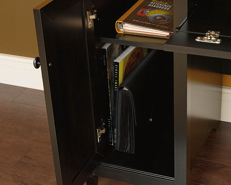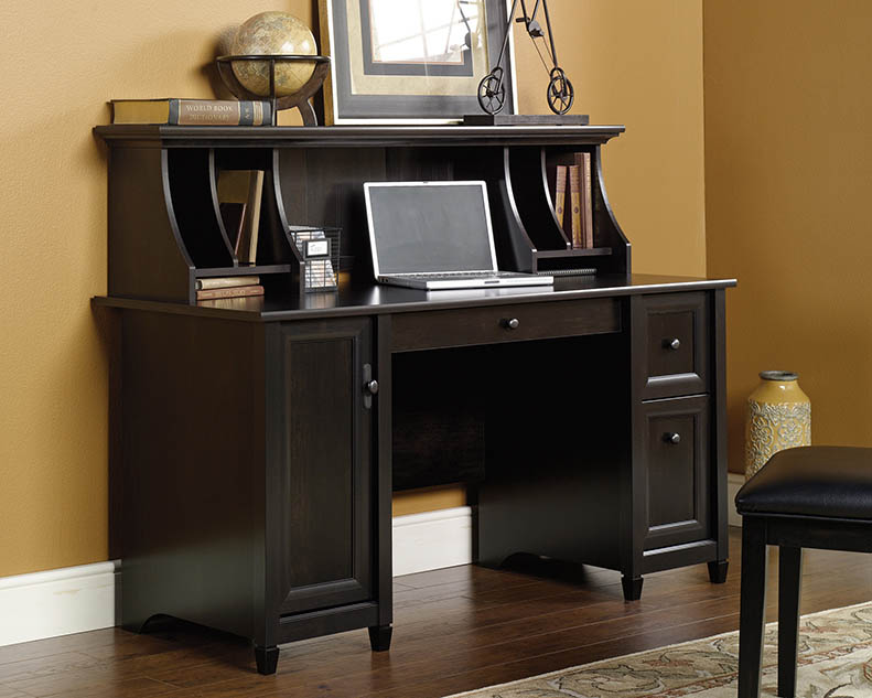 Work in style! Add some classic beauty to your office with this computer desk from the Edge Water collection. It has a spacious tabletop for all your office essentials – laptop, paper, and of course your favorite coffee cup. It features a flip-down molding that reveals a slide-out keyboard/mouse shelf, a storage area behind the door to hold a vertical CPU tower, and two drawers that open and close on smooth metal runners. The lower drawer holds letter or European size hanging files! Finished in Estate Black with solid wood accents, this classy desk is just what your office has been looking for.