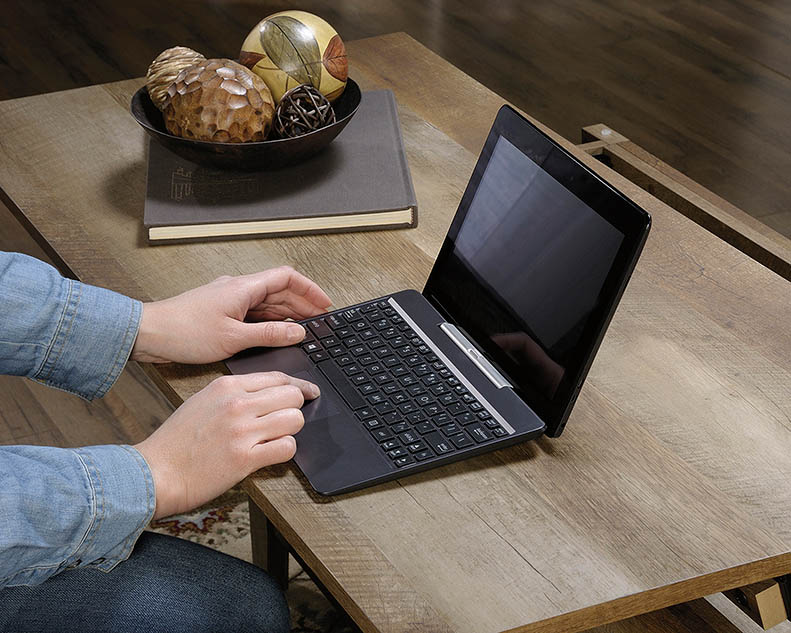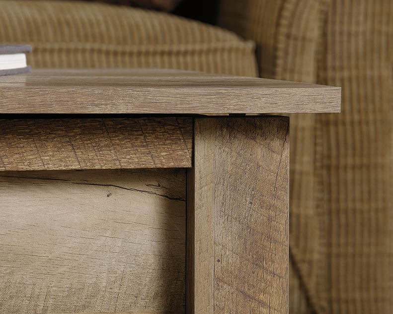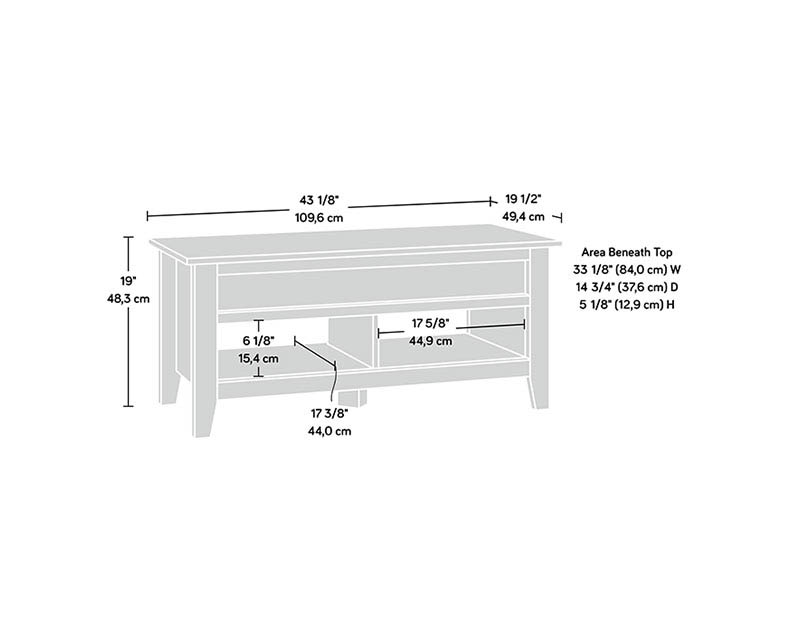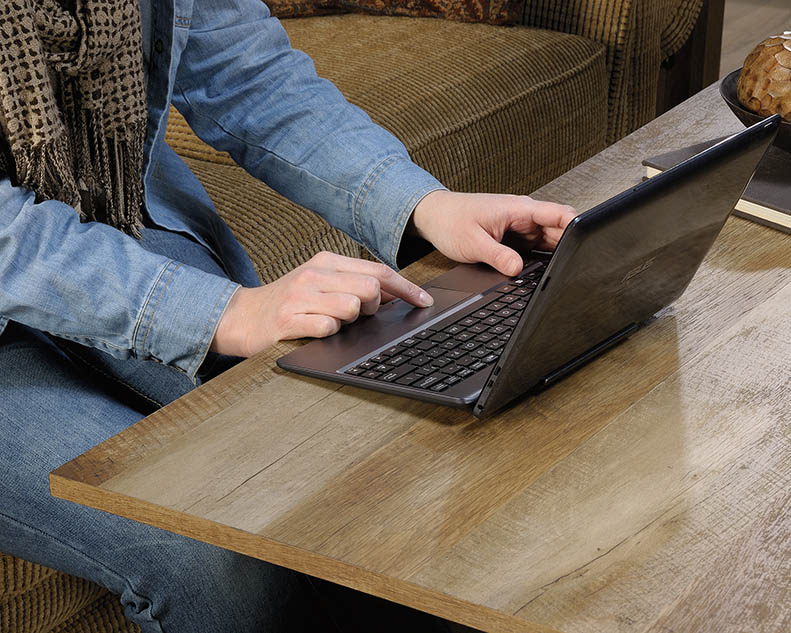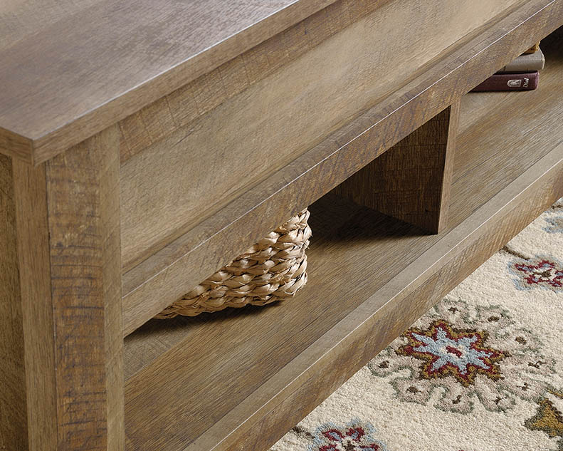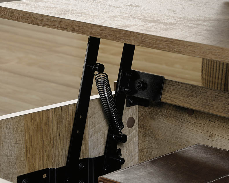 Redefine your living space with this unique lift-top coffee table from Sauder’s Dakota Pass collection. Lift the top up and forward to turn this coffee table into a multipurpose work surface. Work from home, surf the web, or eat a snack while relaxing on your couch with this rustic lift-top coffee table. Store blankets, board games and more on open shelves and hidden storage compartments under the top of the coffee table. Finished on all sides in rustic Craftsman Oak, add style and function to your living room with this versatile rustic lift-top coffee table from Sauder.