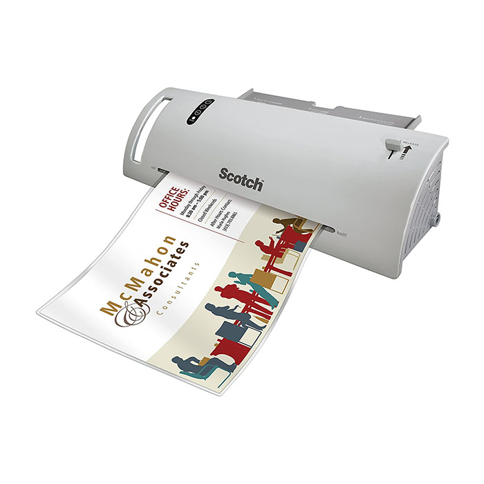 Scotch Thermal Laminator is easy to use and will laminate items up to 9 in wide. Features a 2 roller system that has two temperature settings for 3 mil and 5 mil. This machine has a 4 minute warm-up, feeds 11.5 inches/minute, with pouch release mechanism in case of mis-feed. Portable with a carry handle, fold-in tray and cord storage wrap.